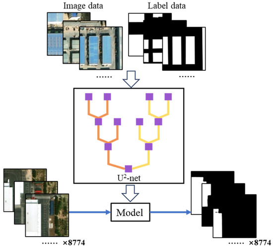 (1) Data acquisition. It mainly includes land type vector data acquisition, satellite image acquisition, and labeling data acquisition. Since the roof of industrial buildings tends to have a simpler structure, the roof profile is mostly distributed in a rectangular shape, and the area is usually larger, and the structure of civil buildings is more complex, and the roof profile is mostly distributed in irregular polygons, the satellite image data are simply categorized into industrial buildings and civil buildings before training using the deep learning model. The land type vector data of Lanzhou New District is obtained through the open-source data website for building classification. The original satellite images are from ESRI satellite image maps, and the satellite maps are gridded and exported through QGIS software (Version number is 3.26.). Labeling data (including two types of labels: “roof” and “background”) are produced by LabelMe.