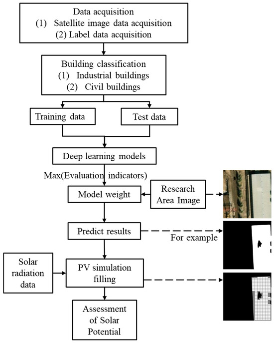 In this paper, the main purpose is to identify the roof area in the satellite image through the image identification method based on deep learning and calculate the identified area of the roof, synchronously calculate the area of the area where the simulated photovoltaic panels can be installed, and finally, combine with the intensity of the regional solar radiation to calculate the solar photovoltaic potential of the study area so that it can be used to guide the planning of the utilization of urban solar energy resources. The flow of the research route of this paper is shown in Figure 2. The process mainly includes data acquisition, model training, PV simulation filling, and solar potential assessment.