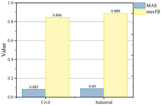 This part mainly shows the deep learning model training results for industrial and civil buildings. As shown in Figure 6, both are the optimal results retained after 200 iterations of calculation through the model. Among them, the identification accuracy of the roof area of industrial buildings is higher, with a maximum maxFβ value of 0.889 and an MAE value of 0.09. While the identification results of the roof area of civil buildings are slightly lower, with a maxFβ value of 0.846, which is lower than that of industrial buildings by about 5.08%, and the MAE value of 0.083. Overall, the predicted maxFβ values for both types of buildings are higher than 0.84, and the MAE values are lower than 0.09, so the errors in the predictions are both relatively small, and the predictions are better.