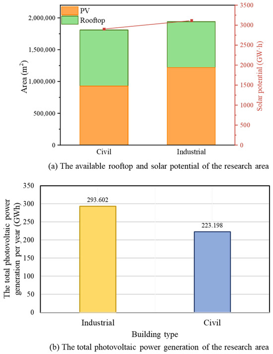 Figure 8a illustrates the comparison between residential and industrial buildings in terms of roof area, available PV panel area, and solar energy potential.