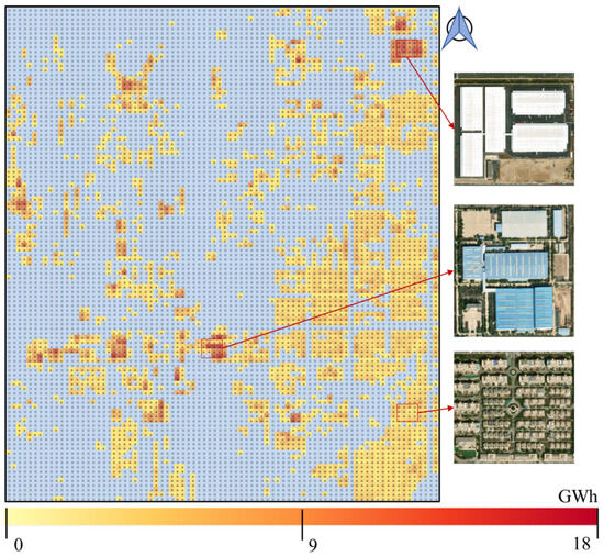 To quantify the emission reduction contribution of large-scale PV deployment to the city-level energy structure, this research area takes a typical area in Lanzhou New District as a case study and integrates the following multi-source data: (1) The city’s annual electricity load baseline (averaged over 2020–2024); (2) GIS-based assessment of the spatial PV potential (integrating rooftop availability, solar radiation, and conversion efficiency). As shown in Figure 12, it aims to provide decision support for renewable energy planning in high-density cities in the arid Northwest region.