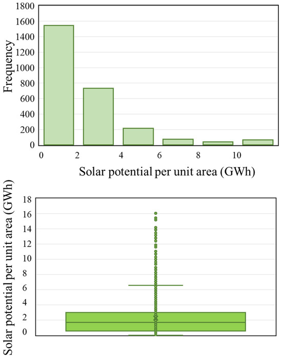 Through the statistics of the results of the 8774 solar potential measurement areas in the research area, the overall frequency and frequency distribution are obtained as shown in Figure 10, and the results of the statistics reflect that the frequency of the solar potential per unit area in the research area is less than 2 GWh, which appears to be the largest, and higher than 6 GWh, which appears to be less frequent, and the maximum value of the regional solar potential is 16.056 GWh, and the overall average value of solar potential of each area is 2.25 GWh. The average value of solar potential is 2.25 GWh, which indicates that the planning of urban PV utilization potential in this region can prioritize the development of high-potential key areas. At the same time, it provides a quantitative standard for the planning and development basis of urban PV utilization potential.