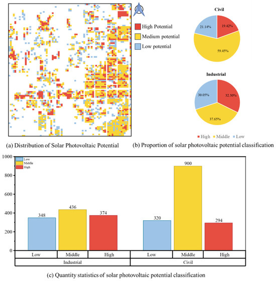 By calculating and counting the solar potential corresponding to each area region in the research area, and at the same time, the results of solar potential calculations are sorted from high to low and graded and processed, divided into three levels according to the size of the solar potential. The overall summary of the solar potential of the value of higher than 75% of the area is defined as a high-potential area, the area between 25% and 75% of the area is defined as a medium-potential area, and less than 25% is defined as a low-potential area. Finally, the results are visualized as shown in Figure 11. Combined with the analysis of land use types in the Lanzhou New District in Figure 3, the solar potential levels of industrial and civil building areas are mainly counted. As shown in Figure 11b,c, for civil buildings, the number of high, medium, and low potential regions are 294, 900, and 320, respectively, of which the proportion of high potential areas is 19.42%, the proportion of medium potential areas is 59.45%, and the proportion of low potential areas is 21.14%. For industrial buildings, the number of high, medium, and low potential regions is 374, 436, and 348, respectively, with 32.30% of high potential regions, 37.65% of medium potential regions, and 30.05% of low potential regions. The regional solar potential grading of civil buildings varies greatly, showing that it is dominated by medium-potential regions, and the proportion of high- and low-potential regions is relatively small. The regional solar potential grading level of industrial buildings is more average, in which the number of high-potential areas is higher than that of civil buildings by 80, which has higher potential and value for solar energy development and is more conducive to the centralized development and implementation of urban photovoltaic planning.