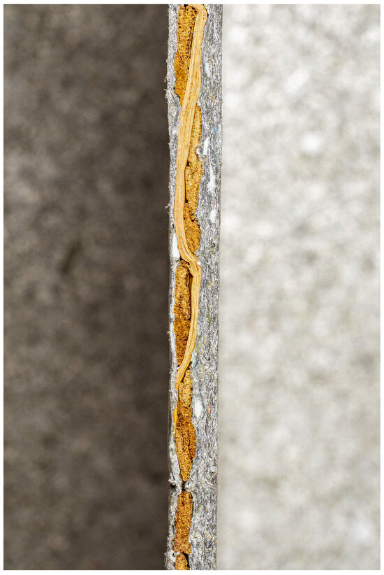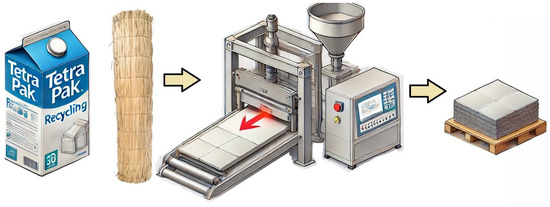 Figure 1 illustrates the manufacturing sequence. The process begins with the collection and mechanical shredding of used Tetra Pak containers. In parallel, bundles of dried totora stems are prepared, often processed into cross-woven mats or fiber-aligned layers depending on the desired reinforcement pattern. Both materials are then arranged in a mold and introduced into a high-temperature compression molding press. This equipment, capable of reaching 300 °C and exerting pressures up to 300 kN, ensures that the LDPE–Al matrix melts sufficiently to encapsulate the totora structure, promoting strong interfacial bonding. The press’s mold opening, extending up to 175 mm, offers flexibility in panel thickness, accommodating diverse construction needs such as tiles, partition panels, or insulating layers [41,42].