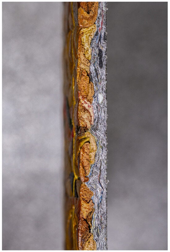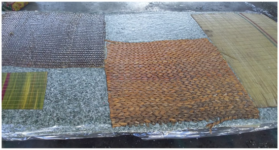 Two distinct composite configurations emerged from this method. The first variant, shown in Figure 2, integrates a cross-woven totora surface directly bonded to an LDPE–A layer. This approach preserves the traditional weaving technique and enhances the material’s anisotropic mechanical behavior by orienting fibers orthogonally. The second configuration, illustrated in Figure 3, adopts a sandwich structure, encapsulating a core of totora between two external LDPE–Al layers. This symmetric laminate mimics the structure of engineered panels, providing improved dimensional stability and environmental resistance.