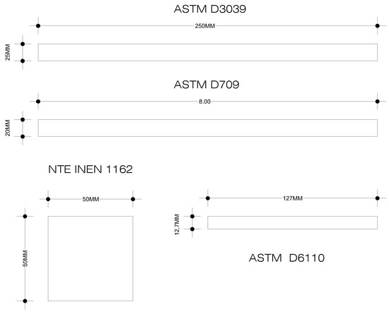 Figure 4 illustrates the exact dimensions of each test specimen format. The tensile specimens for ASTM D3039 were 250 mm long and 25 mm wide, suitable for uniaxial tensile testing. The flexural test specimens, based on ASTM D790, were similarly 250 mm in length but narrower at 20 mm to meet the span-to-depth ratio requirements. The ASTM D6110 specimens for the Charpy impact tests were prepared with dimensions of 127 mm in length and 12.7 mm in thickness, allowing precise measurement of fracture energy. The compression specimens, complying with NTE INEN 1162, were square sections of 50 mm by 50 mm, appropriate for assessing load resistance in planar directions. This dimensional rigor ensured the validity and comparability of the results, establishing a robust foundation for interpreting the mechanical behavior of the innovative composite.