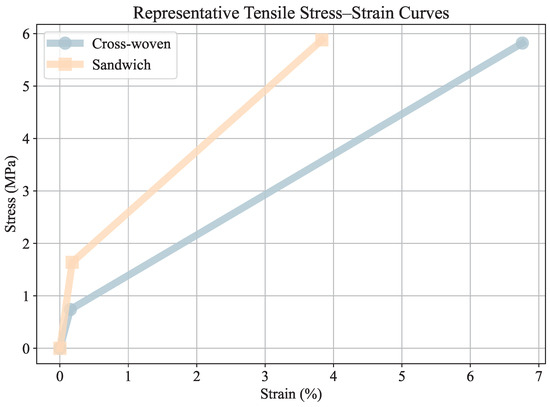 Representative stress–strain curves for tensile tests of cross-woven and sandwich composites, based on average mechanical parameters.