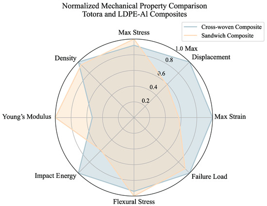 Normalized mechanical property comparison between cross-woven and sandwich totora–LDPE–Al composites across eight performance metrics. The radar chart highlights differences in strain capacity, stiffness, impact resistance, and density.