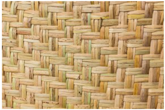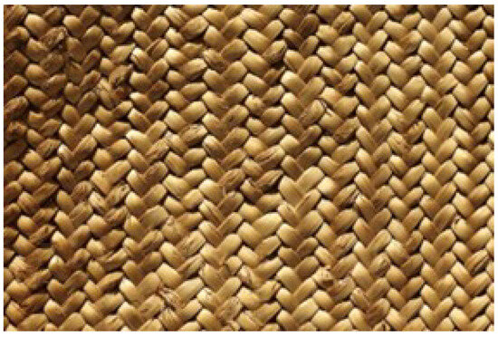 Figure 9 and Figure 10 present two key woven configurations developed during the study. Figure 9 illustrates the cross-weave pattern, characterized by orthogonal strand interlacing that provides dimensional stability and structural integrity. This configuration is well-suited for load-bearing applications such as internal wall panels, ceiling tiles, or modular partitions. In contrast, the design in Figure 10 features a tighter, interlaced weave that enhances pliability while maintaining surface cohesion. This structure is advantageous in applications requiring curved surfaces, decorative coverings, or elements exposed to moderate deformation. Both weave types underscore the aesthetic and mechanical versatility of totora-based composites, highlighting their suitability for sustainable architecture and design innovations grounded in circular economy principles.