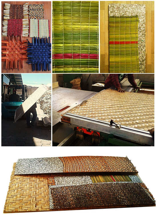 The manufacturing methodology developed in this study effectively integrates cross-woven and sandwich configurations of totora with recycled low-density polyethylene-aluminum (LDPE–Al), using thermo-compression processes that allow for material versatility. Combining biodegradable fibers with post-consumer thermoplastics promotes circular economy principles while enabling scalable production for construction-oriented applications.