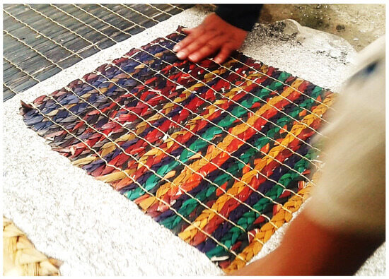 The development of the totora-and-LDPE–Al composites was executed through a collaborative process rooted in artisanal expertise and supported by structured thermocompression techniques. According to the methodology outlined by Jara (2018) [43], the LDPE–A matrix material—supplied by Ecuaplastic S.C.—was combined with totora harvested from the San José de la Laguna Parish in Otavalo, Ecuador. The fabrication process, led by the artisan group Totorawasi under the direction of Marta Gonza, followed a thermal cycle gradually increasing from (160 °C) to (180 °C), sustained over 35 to 45 min. This temperature range enabled a progressive fusion of the LDPE–Al component without compromising the structural integrity of the totora fibers, thereby facilitating effective interfacial adhesion and minimizing thermal degradation of the plant matrix.
