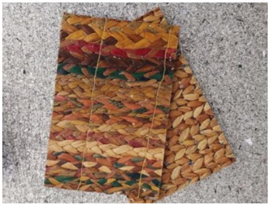 The composite panels developed in this study exhibit significant versatility, enabling their application in diverse architectural and interior environments. Potential uses include wall claddings, floor coverings, false ceilings, modular furniture, cabinetry, and ventilated facades. Figure 14 displays two manufactured flat panels featuring a richly colored interlaced weave. These panels demonstrate how natural totora fibers, when combined with recycled LDPE–Al, can result in high-performance materials that are both visually distinctive and mechanically robust. The interplay between the natural fiber texture and the laminated thermoplastic matrix not only provides strength and dimensional stability but also adds an artisanal aesthetic, ideal for contemporary and heritage-sensitive design contexts.