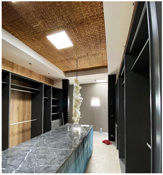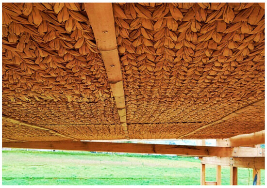 In addition to external structural use, these composites exhibit excellent potential in interior design. Figure 17 presents an application in ceiling architecture, where the material not only contributes structurally but also enhances the visual and textural identity of the space. The natural tone and fiber pattern of totora introduce warmth and organic appeal, while the recycled matrix ensures durability and longevity. Such applications illustrate the hybrid role of this material—as both a load-bearing and aesthetic element—demonstrating its adaptability across architectural scales. Continued exploration is needed to assess fire behavior, UV resistance, and lifecycle performance, which will support broader implementation in both commercial and residential environments.