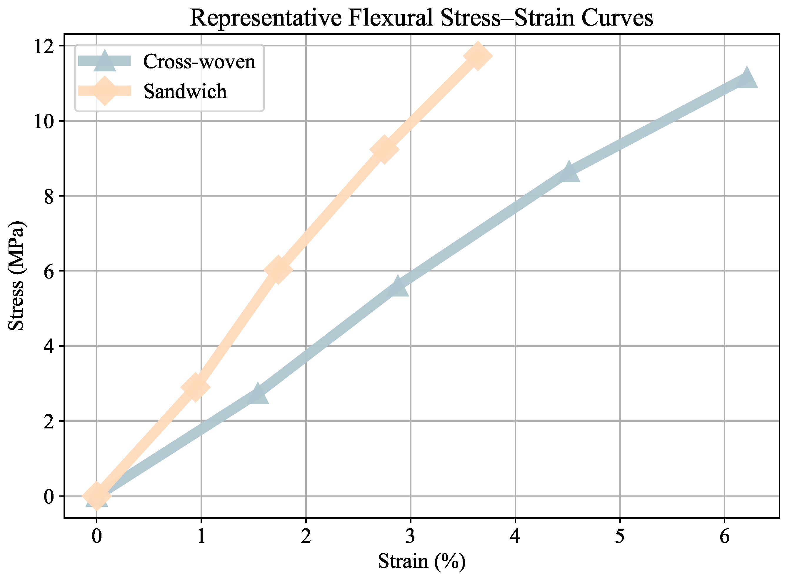 Representative flexural stress–strain curves for cross-woven and sandwich composite configurations.