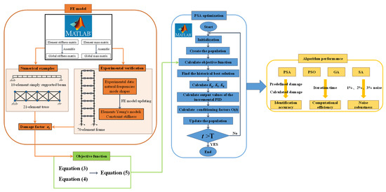 The workflow of this study is illustrated in Figure 3. The programming and numerical computations are performed in MATLAB R2023b [41,42]. In the FE analysis phase, the element stiffness matrices and element mass matrices are systematically assembled into global matrices, after which eigenvalue analysis is conducted to characterize the structural dynamic properties. Following the introduction of damage factors, the objective function defined in Equation (5) is computed from the resultant data and employed as the fitness for the PSA. The PSA iterative solution process is then executed in accordance with the computational framework established by Equations (6)–(14). The SDI performance of PSA is subsequently evaluated through comparative analysis with PSO, GA, and SA algorithms. To ensure a fair comparison, the population size of all algorithms was uniformly set to 30.