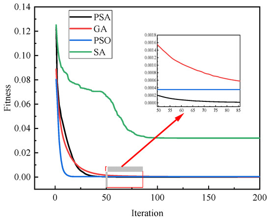 This study selects three representative optimization algorithms for comparative analysis with PSA: GA representing evolutionary algorithms, PSO as a swarm optimization algorithm, and SA representing physics-inspired optimization algorithms. The specific parameter settings for each algorithm are provided in Table 1. In the GA implementation, the crossover rate governs the production of new candidate solutions, while the mutation rate collectively introduces stochastic elements into the evolutionary process, and tournament size is used to select superior individuals from the current population to participate in crossover and mutation operations. The PSO algorithm employs an inertia weight w to modulate the influence of a particle’s current velocity on its subsequent movement, while c1 and c2 directly influence the algorithm’s convergence behavior and search capability by balancing the trade-off between individual experience and swarm cooperation. For the SA, the initial temperature parameter regulates the probability of accepting suboptimal solutions during the exploration phase, whereas the cooling rate parameter governs the convergence characteristics throughout the iterative process. Within the PSA framework, the control parameters Kp, Ki, and Kd respectively determine the adjustment rates for the proportional, integral, and derivative components of the control strategy.