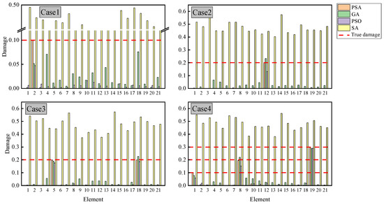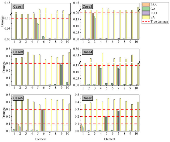 The SDI results are presented in Figure 6. While GA, PSO, and PSA successfully localized damage across all cases, significant discrepancies emerged in their ability to quantify damage severity. PSA achieves near-complete identification of damage severity, exhibiting substantially superior performance compared to both GA and PSO. For instance, in Case 3, PSA estimated a 29.9% stiffness reduction in element 9 with error < 1%, whereas GA and PSO yielded 0.274 (8.7% error) and 0.282 (6% error), respectively. Case 6 further highlighted PSA’s superiority in multi-location damage scenarios; although GA, PSO, and PSA accurately quantified damage in element 5 with 0.198–0.199 reduction, PSA uniquely maintained precision for elements 1 and 7, while GA and PSO exhibited deviations exceeding 10%. In contrast, SA failed to achieve reliable identification in all six test cases. Its limitations became pronounced in high-dimensional search spaces, particularly when optimizing multi-peak objective functions characteristic of complex damage patterns. This manifested as slow convergence rates and susceptibility to local minima.
