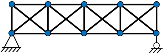 This section examines the effect of measurement noise on SDI performance. The analysis employs a 21-member truss structure, with its configuration graphically presented in Figure 7. All structural elements possess two degrees of freedom. The upper and lower chord members have a uniform length of 2.5 m, while the web members measure 2 m in length. The structural components utilize circular steel cross-sections characterized by an elastic modulus of 210 GPa, a material density of 7800 kg/m3, and a cross-sectional area of 5 × 10−3 m3.