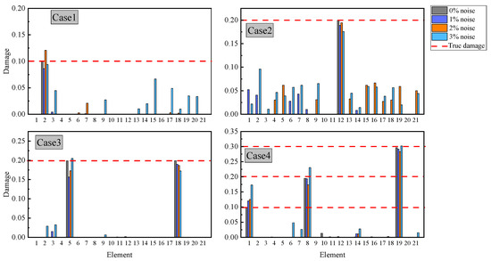 Two damage scenarios were predefined: Case 1 with 12.5% damage in Element 12, and Case 2 with 12.5% damage in both Elements 6 and 12. In practical SDI, measured dynamic parameters are inevitably affected by noise. Based on the updated model, three noise levels are applied, where the regularization coefficient λ in Equation (5) is set to 0 and 0.005, respectively, to examine the effect of the regularization term on identification accuracy, and the SDI results are shown in Figure 11 and Figure 12.