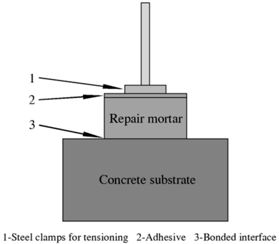The concrete substrate utilized in the tensile bond test had a mix proportion of 1:1.72:2.69:0.39 (cement, sand, gravel, and water). When this substrate was allowed to cure naturally for 28 days, its compressive strength reached 43.2 MPa. Table 6 displays the precise mix proportion.