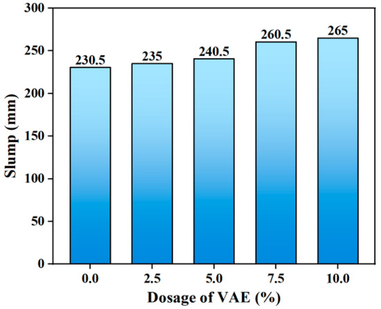 The impact of varying VAE dosages on the fluidity of OPC-SF repair mortar is depicted in Figure 2. The findings indicate that the mortar’s fluidity is trending upward as the VAE dosage is increased. The fluidities of the specimens with VAE dosages of 2.5 wt.%, 5.0 wt.%, 7.5 wt.%, and 10.0 wt.% increased by 1.95%, 4.34%, 13.02%, and 14.97%, respectively, in comparison to the reference group (0 wt.% VAE). A maximum fluidity increase of 14.97% is observed at the VAE dosage of 10.0 wt.%. This result demonstrates that a reasonable amount of VAE integration can successfully boost the fluidity of the repair mortar.
