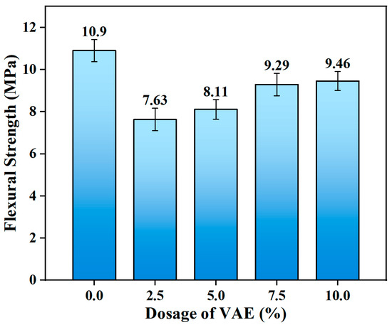 As shown in Figure 3, different VAE dosages have a nonlinear influence on the 28-day flexural strength of OPC-SF repair mortar. The findings indicate that as the VAE dosage increases from 0 wt.% to 10.0 wt.%, the flexural strength shows a non-monotonic evolution trend of first decreasing and then increasing. All modified groups’ flexural strengths, however, fall short of the reference group’s (0 wt.% VAE). The specimens with VAE dosages of 2.5 wt.%, 5 wt.%, 7.5 wt.% and 10.0 wt.% have flexural strengths of 7.63 MPa (a decrease of 30.0%), 8.11 MPa (a decrease of 25.6%), 9.29 MPa (a decrease of 14.8%), and 9.46 MPa (a decrease of 13.2%), respectively. It is important to note that at low dosages (2.5 wt.%), the strength loss is most noticeable, but at high dosages (10.0 wt.%), the reduction slows down.