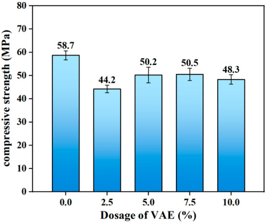 The findings show a substantial nonlinear relationship between the mortar’s compressive strength and the VAE dosage (see Figure 4). The reference group (0 wt.% VAE) has a 28-day compressive strength of 58.7 MPa. The compressive strengths exhibit a pattern known as “decrease-increase-decrease again” [9] when the VAE dosages are doped from 2.5 wt.% to 10.0 wt.%. These reduce to 44.2 MPa (a 24.7% decrease), 50.2 MPa (a 14.5% decrease), 50.5 MPa (a 14.0% decrease), and 48.3 MPa (a 17.7% decrease), respectively. There is an ideal dosage range since the compressive strength loss is lowest at the critical dosage (7.5 wt.%).