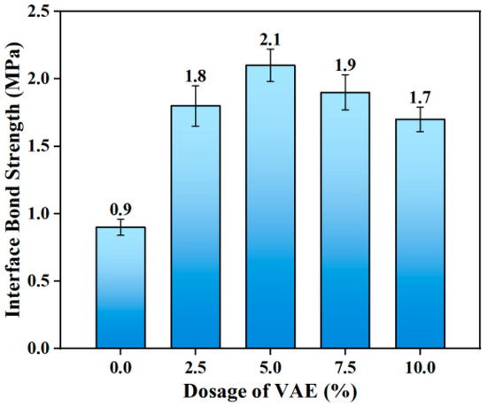 The impact of varying VAE dosages on the interfacial bond strength of OPC-SF repair mortar is shown in Figure 5. The findings demonstrate that there is a notable two-stage response in the interfacial bond strength as the VAE dosage increases. The 28-day interfacial bond strength improves by 133.3% from 0.9 MPa to 2.1 MPa when the VAE dosage is increased from 0 wt.% to 5.0 wt.%. This suggests that VAE has a large dose-dependent strengthening effect on interfacial characteristics in the low-dosage range. However, the bond strength exhibits a reversed attenuation pattern when the dosage surpasses 5.0 wt.%. The strengths of the 7.5 wt.% and 10.0 wt.% groups decreased to 1.9 MPa and 1.7 MPa, respectively, with strength loss rates of 9.5% and 19.0% when compared to the group that received the optimal dosage.