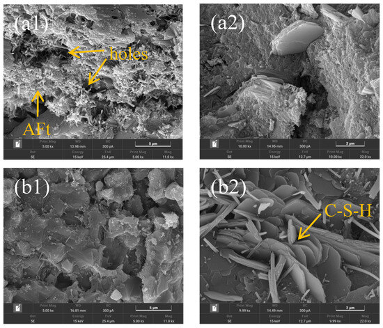 The compactness of the hydration products’ microstructure can be shown by contrasting Figure 6(a1,b1). The reference group exhibits many pores with interconnected microcracks with diameters ranging from 10 to 100 μm. The 5.0 wt.% VAE-modified group, on the other hand, has a very compact and evenly distributed microstructure, with a notable decrease in the quantity of big pores and interconnected microcracks. This suggests that VAE can efficiently fill the pores in the cement microstructure. Simultaneously, the reference group’s hydration products have relatively large crystal sizes and needle-rod-shaped AFt crystals and lamellar C-S-H crystals that mostly form in loosely structured places like pores and fractures. On the other hand, the AFt crystals developing in the pores are more uniformly distributed and considerably smaller in the microstructure of the 5.0 wt.% VAE-modified group. This suggests that the polymer contributes to the cement paste’s grain refinement. The polymer’s filling impact on the cement’s internal pores and the polymer film covering the hydration products’ surface are the two causes of this occurrence. Together, these two elements restrict the hydration products’ development range, which reduces the size of the crystal. This is also supported by Ma’s research [35].