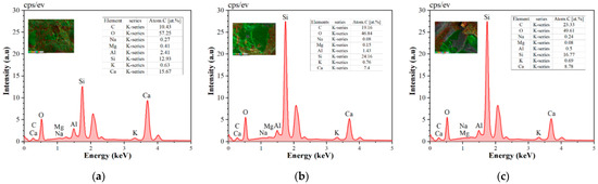EDS diagram of repair mortar: (a) VAE-0 group; (b) VAE-2.5 group; (c) VAE-10 group.