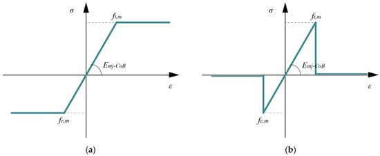 Mortar joints are modeled, coupling axial CoBs (perpendicular to the joint main direction) with elastic orthotropic four-node plane-strain elements, with null Young’s modulus and non-zero shear modulus, or shear panels. If the user chooses orthotropic plate elements, the joint shear modulus ( should be defined, whereas in the case of shear panels, the shear modulus (), Poisson’s ratio , and the density shall be added. The useful CoB properties are the threshold values for tensile () and compressive () strength and Young’s modulus ().