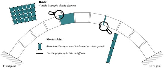 Based on the above, a practical and versatile FE-based approach is proposed for the study of single- [] and double-curvature [,] brickwork assemblies by employing the simplest non-linear truss elements available in any commercial software, namely Cutoff Bars (CoBs), thus avoiding the need for complex and expensive software tools. These elements can exhibit a post-elastic behavior, which can be either perfectly brittle or ductile, and require only basic material input. The mechanical parameters involved can be easily calibrated from standard laboratory tests or assumed from literature values, making the method accessible and applicable in real-world design contexts. Mortar joints, subjected to Mode I failure (typical of unreinforced curved members), are therefore modeled with a simplified 2D approach. Elasto-fragile axial CoBs (mutually parallel and passing through the joint thickness) are used to reproduce the flexural behavior of mortar joints, coupled with shear panels or elastic orthotropic elements. The units (bricks) are assumed linear elastic and meshed with four-node plate FEs [].