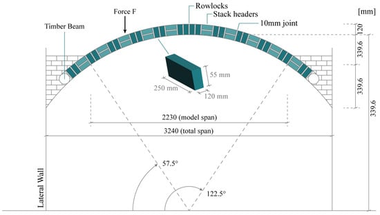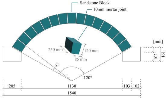 The second benchmark case concerns a laboratory arch tested at the Universidad del Pais Vasco in Spain [,]. The arch was assembled using sandstone blocks, specifically Arenisca de Aguilar, a material commonly employed in restoration works in the province of Palencia (Spain). The mortar was selected to perform similarly to that commonly used in the rehabilitation of ancient masonry structures. Figure 8 shows the arch in detail, with a span equal to 1.13 m, a rise of 0.44 m, a depth equal to 0.25 m, and an in-plane thickness of 0.12 m.
