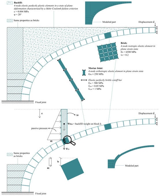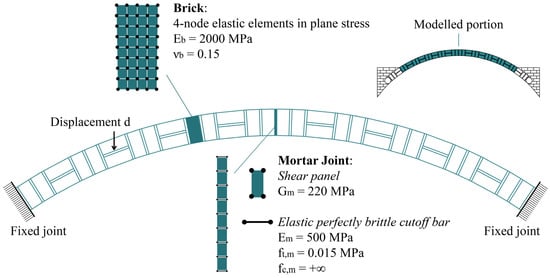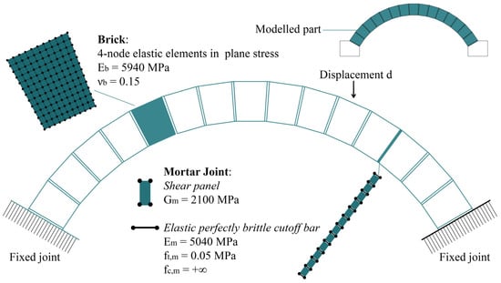 The numerical model of the arch accounts exclusively for Mode I failure. This is justified by the findings in [], which demonstrated that, in the absence of reinforcement, the arch fails solely through the formation of flexural hinges, as also confirmed by the experimental results in []. For this reason, as previously specified, in the FE model, bricks are meshed with quadrilateral elastic elements, whereas shear panels and CoBs guarantee the formation of the expected mechanism. The detailed model configuration is depicted in Figure 4, together with the mechanical properties of the elements involved.