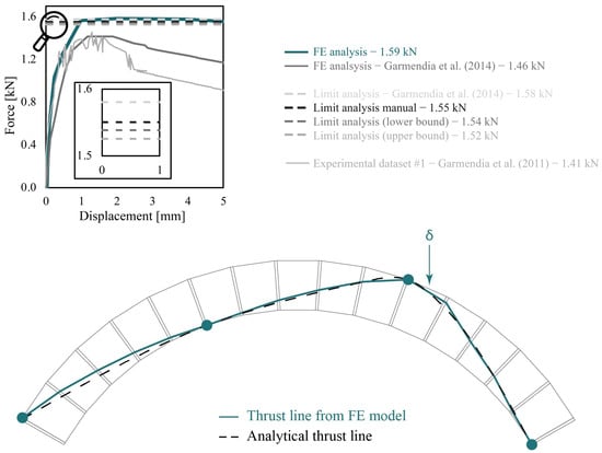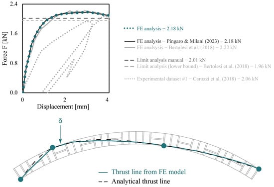 To further validate the findings, three additional analyses were performed: (i) manual, (ii) advanced lower bound, and (iii) upper bound Limit Analyses. The latter were carried out using the code developed in []. Figure 10 shows an almost perfect overlapping between the results obtained with the proposed FE model and the LA performed by the authors. Furthermore, a very similar collapse load was reported in [] using the commercial software Ring 3.0 for LA.