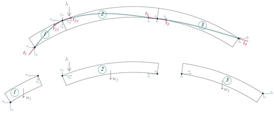 The thrust line is obtained through a post-processing procedure that integrates the axial forces in each Cutoff Bar across the area of its corresponding joint [,]. In fact, a weighted average based on the eccentricity of the axial forces is performed. This enables the reconstruction of the internal load path, consistent with the formation of plastic hinges. For comparison, a thrust line derived via analytical solution based on equilibrium between macroblocks is also plotted in black in Figure 5. As shown in Figure 6, the macroblocks are defined based on the hinge positions obtained from the FE analysis. For each macroblock, the corresponding equilibrium equations are formulated—two translational and one rotational—resulting in a total of nine equations. However, the unknowns depicted in Figure 6 amount to ten. Therefore, an additional equation is required, enforcing the condition that the vectors and , resulting from the sum of components , and , must be equal in magnitude and opposite in direction.
