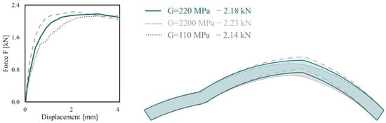 To assess how responsive the model is to the shear panel parameters, a sensitivity analysis is conducted on the shear modulus (G) of these elements. The structural capacity obtained using a shear modulus of 220 MPa is compared with the responses computed assuming G is equal to 10 times and 0.5 times the experimental value, with the elastic modulus of the CoBs adjusted accordingly. As shown in Figure 7, the shear modulus has a limited influence on the structural response in terms of load-bearing capacity. However, the initial elastic stiffness differs in the three cases, as expected. The failure mechanism remains unchanged, although some sliding is observed in the case with the lowest G value in the left portion of the arch. These results suggest that the shear panel parameters should be selected carefully to accurately capture the initial elastic stiffness of the structure. For this reason, a shear modulus of 220 MPa was adopted, in line with experimental data and the technical literature [].