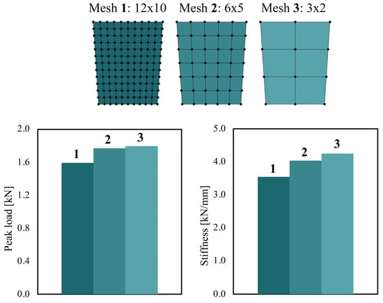 Mesh sensitivity analysis: three different discretizations are compared—Mesh 1 (12 × 10 elements), Mesh 2 (6 × 5 elements), and Mesh 3 (3 × 2 elements)—in terms of peak load (left) and global stiffness (right).