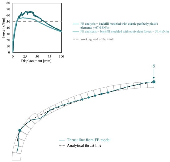 Figure 14 presents the global load–displacement curve, with a peak load of 67.0 kN/m and 56.4 kN/m, respectively, for the models with the backfill discretized with plate elements and equivalent concentrated forces. The last flexural plastic hinge forms at the springing, while the intermediate series of hinges indicates the formation of a smeared crack pattern at approximately one-third of the span (see Figure 14). As for the previous case studies, the resulting thrust line is compared to the one derived through the analytical approach detailed in Section 3.1.
