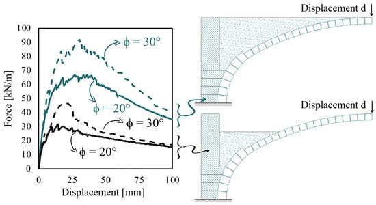 As for the previous case, the analysis tested the capacity of the model under gravity load, followed by an increasing vertical displacement. The displacement was applied at the same point as the vertical force F in the laboratory test, as depicted in Figure 9. Fixed constraints are assumed at the springing of the arch.