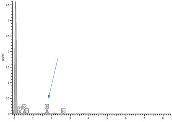 Analysis of elements present in the nano silicon based on EDS was established as illustrated in Figure 1. This indicates spectra intensity of carbon (C), oxygen (O), fluorine (F), and chlorine (Cl) associated with silicon (Si). As can be seen using arrow from Figure 1, particles have a high content of silicon as depicted by the spectra intensity. This is evidently clear in the highest peak due to silicon. This is similar to the findings of [58]. On the other hand, Fluorine and chlorine were due to impurity as a result of cross-linking of alkyl-halogen functionalized particles.