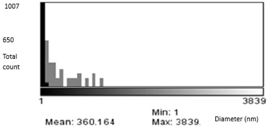 As can be seen from Figure 4, the distribution pattern of nano silicon particles indicates variation from 1.0 nm up to the largest size of 3839 nm. Furthermore, the figure shows that the mean size is 360 nm, which is in accordance with the findings of [60,61]. This indicates well-graded and distributed nano silicon particles and, thus, it is suitable for thorough mixing with cementitious materials.
