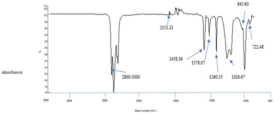 Figure 5 FTIR shows the spectra for Organic Functional (Bonding) groups attached to nano silicon. The figure indicates Si-C deformation vibration at 1260.55 cm−1 and stretching vibration at 843.60 cm−1. It also displays a peak for the C-H stretching band at 2800–3000 cm−1. Furthermore, the figure shows a CH2- deformation band at 1458.36 cm−1, C-CH3 symmetrical deformation band at 1378.07 cm−1, and -(CH2)4- skeletal vibration at 722.48 cm−1. Again, it indicates bands for Si-H stretching at 2151.21 cm−1, Si-O stretching modes including Si-O-Si, and Si-OH at 1026.67 cm−1. On the aggregate, these results indicate that the surface bonding groups attached to nano silicon are organic functional groups and, thus, make it a hydrophobic material with the ability to repel water. These are consistent and also similar to the findings of [63,64].