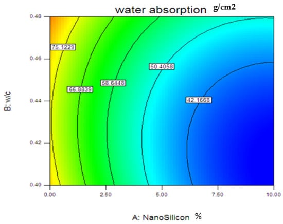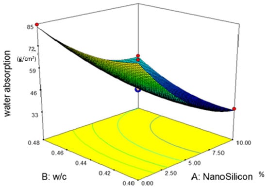To model and establish the optimum mix ratio (in terms of nano silicon and w/c), necessary to increase water resistance, the experiment was planned using Response Surface Methodology (RSM). The mathematical relationship between factors (nano silicon and w/c) influencing the exact response (capillary water absorption) was developed based on theories that are appropriate and established by previous studies [47,48,49]. In this type of technique (RSM), experimental inputs are used to establish a mathematical model.