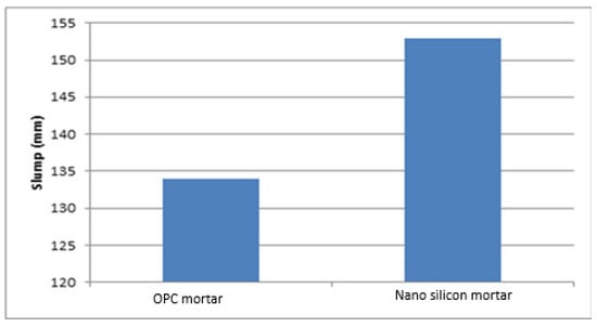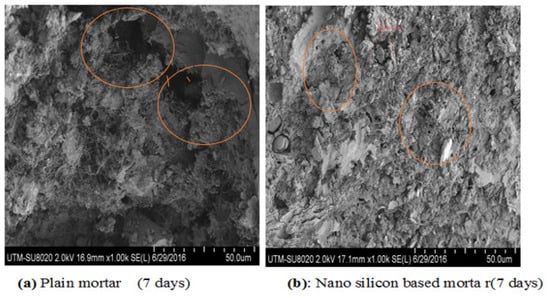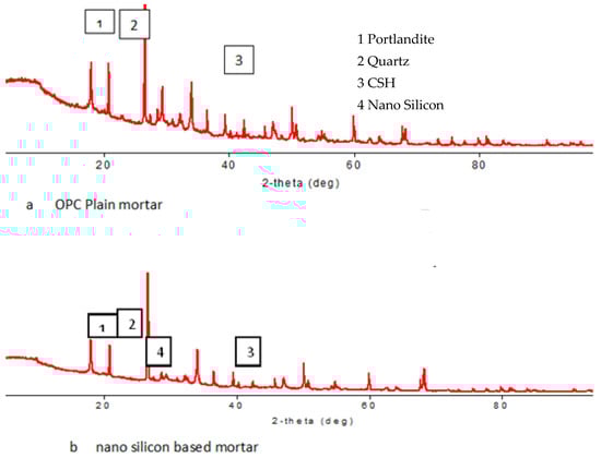 Table 3 shows the average values of surface charges for the nano silicon and OPC plain mortars, respectively. It is obvious from the table that while OPC plain mortar has a positive Zeta potential value of +0.744 mV, on the other hand, the magnitude of the Zeta potential for nano silicon was −0.0718, which has the opposite charge as compared to the plain mortar. This implies highly positive zeta potential of OPC, which can adsorb a great amount of negatively charged nano silicon. Consequently, this leads to the formation of mechanical bond with cement hydration product of plain mortar due to electrostatic force. This corroborated the finding of [62], where they established potential adsorption of superplasticizers by cement hydration product of a plain mortar.
