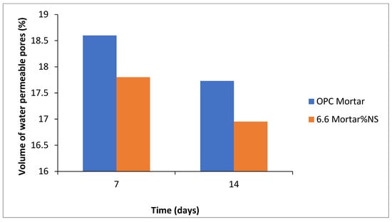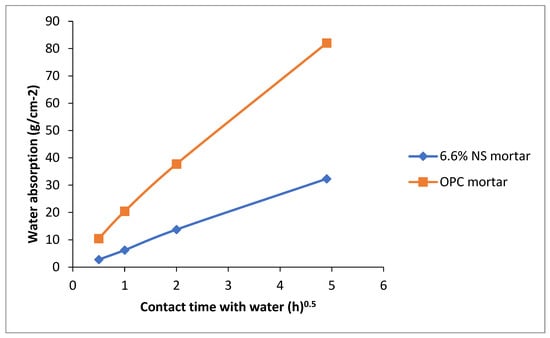Table 4 indicates that capillary water absorption decreases with the increase in nano silicon dosage. Furthermore, capillary water absorption appears to decrease as the w/c decreases. Accordingly, this is in line with common theories that as w/c ratio decreases, water absorption and compressive strength increase. Likewise, this corroborated similar scenario and findings of [65,66,67] where certain additives were used as waterproofing admixtures for restoration of historical buildings. This accounted for improvement in hardened properties of cementitious materials.