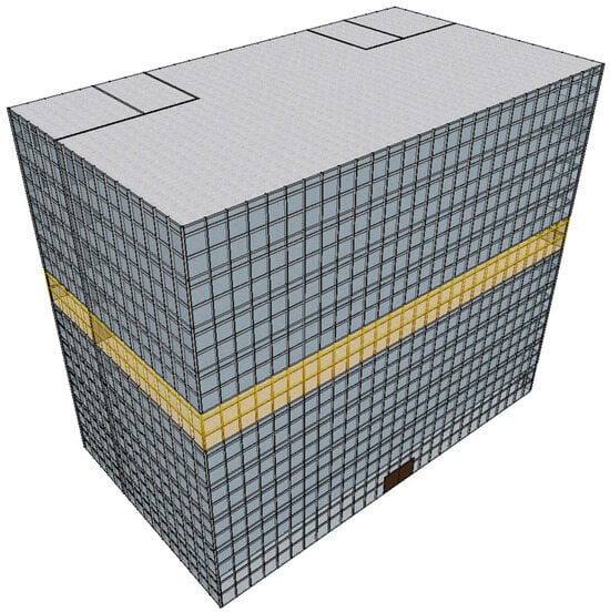 Field investigations of office buildings revealed that glass curtain wall designs are widely employed in modern office architecture []. While glass curtain walls enhance the architectural appearance of buildings, they also significantly increase solar heat gain, thereby affecting both human thermal comfort and building energy consumption []. To study the impact of solar heat gain on indoor thermal comfort, a typical glass curtain wall office building was selected as the simulation model. Figure 2 illustrates the floor plan of the building. The building consists of ten floors, each with a floor area of 1008 m2. Figure 3 presents the southwest elevation of the building. The layout is simple and functional, meeting the typical requirements of office buildings.