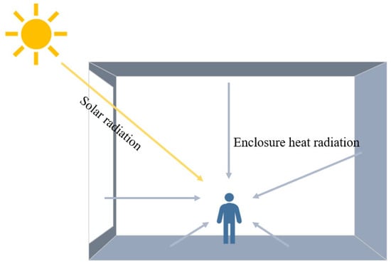 Compared to using air temperature alone as an evaluation criterion, the PMV model provides a more scientifically rigorous representation of dynamic changes in human thermal comfort []. As indicated by the above equation, one of the most critical parameters in PMV calculation is the mean radiant temperature (MRT) of the surrounding environment, especially in glass curtain wall buildings. MRT is influenced by two primary sources of radiation, (1) solar radiation and (2) heat radiation from the inner surface of the building envelope, as illustrated in Figure 5. To accurately determine MRT, the SolarCal model was employed for calculation [].