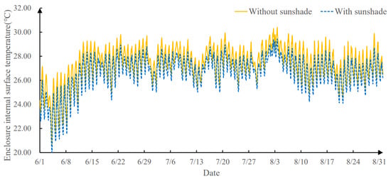 In glass curtain wall buildings, occupants’ thermal sensation is influenced by both heat transfer through windows and walls and direct solar radiation. These factors alter the mean radiant temperature, thereby affecting indoor thermal comfort. In this study, the DeST software was used to simulate the hourly inner surface temperatures of office building walls during the air conditioning season. The results are illustrated in Figure 6.