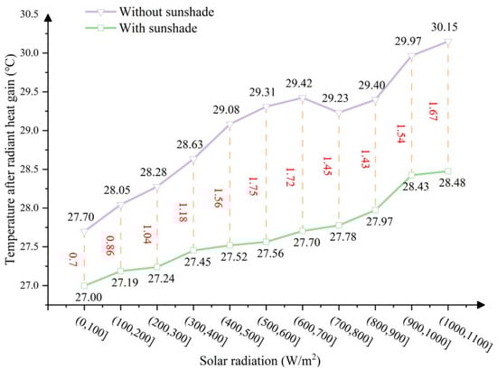This study analyzes the variation in the indoor MRT under different levels of solar radiation intensity based on the simulation data. To facilitate analysis, the solar radiation intensity was grouped into intervals of 100 W/m2, encompassing the full range of solar radiation during the cooling season. The average air conditioning setpoint temperature within each interval was calculated to simplify data processing, while maintaining scientific rigor and comparability. Figure 7 illustrates the impact of solar radiation intensity on the MRT under both the shaded and unshaded conditions.